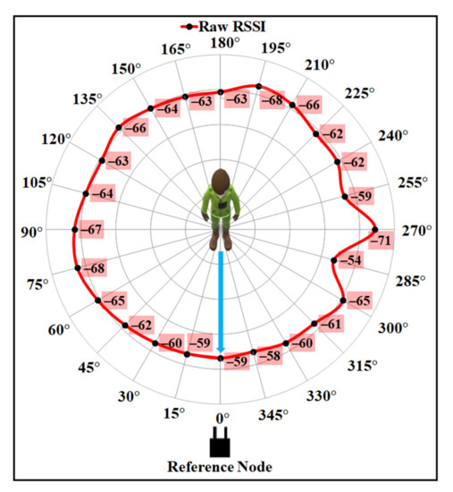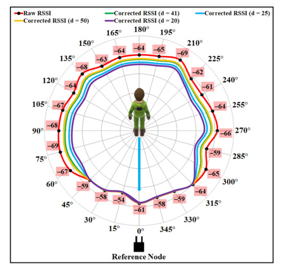 The proposed BSE compensation model was evaluated firstly using the same experimental data as shown in Figure 2. The polar plot for the raw data is shown in Figure 12, where the distance between the sender and the receiver is 9.9 m. It is noticeable from the figure that the minimum and maximum attenuation of RF signals occur at the angle positions as discussed in Section 3.2, due to the effect of the user’s body. The higher RSSI value is observed at approximately with LOS angle positions, and the lowest values of RSSI can be observed at approximately and angle positions for the raw RSSI data.