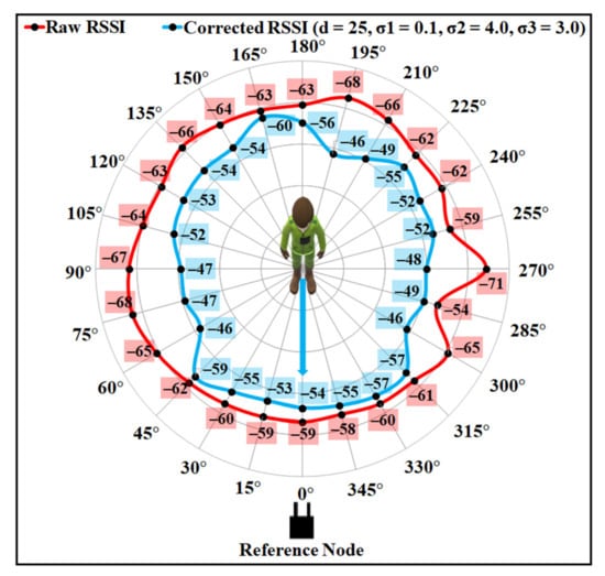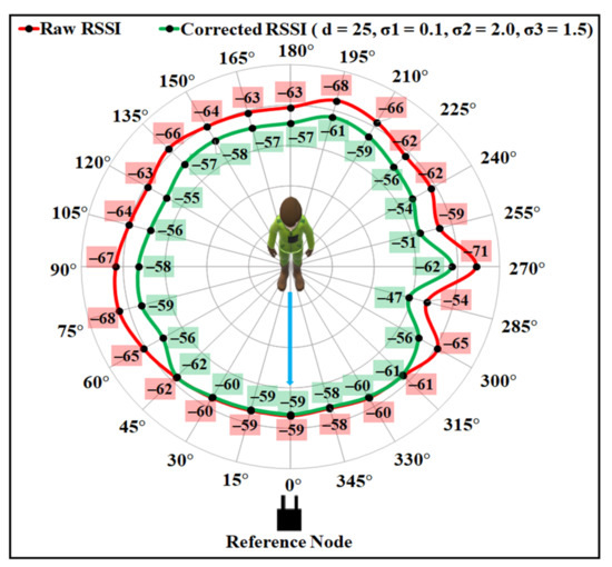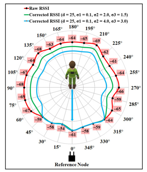 To validate the efficiency of the proposed model, RSSI data were also collected using the same experimental setup, except the wearable device was placed on the back of a user. Figure 15 illustrates the compensation results along with the raw RSSI for the two different sets of values. As can be seen from the figure, the values of , , and as 0.1, 2.0, and 1.5 can produce the best estimates for most of the angle positions, compared to the other set.