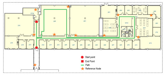 To evaluate the performance of the proposed localisation system, experiments were performed in an office building. The experiment building was Building 72 at the Clayton campus of Monash University, which comprises three floors. The experiment was carried out on the second floor, with a total area of about 1475 , and the length of the test path was about 150 , represented by the green line in Figure 17. The path starts from the red circle, then follows the path, and ends at the red square.