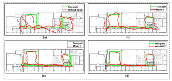 Routes estimated by different systems using the K-NN method: (a) Without BSEC; (b) Model I; (c) Model II and (d) With BSEC.