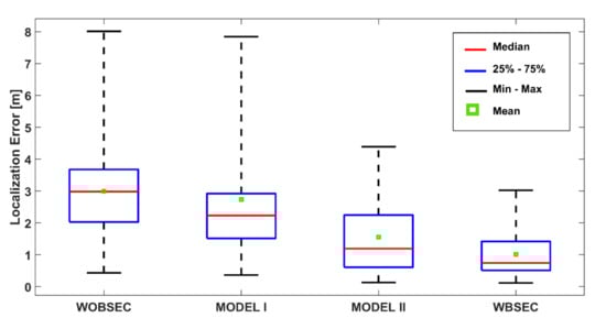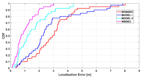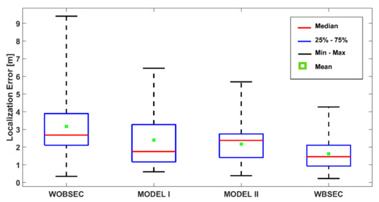 The details of the positioning performance are presented in Figure 19 and Table 2 for the K-NN algorithm. The boxplot indicates the summary of some error statistics including the maximum, minimum, 25th, 75th, mean, and median errors for each system. As presented in Figure 19 and Table 2, the proposed system significantly outperformed the other systems for all types of statistics. The proposed system demonstrated the best performance with a mean error of 1.62 m and median error of 1.46 m, followed by MODEL II (mean error 2.17 m and median error 2.38 m). The mean and median errors of MODEL I were 2.39 m and 1.75 m, respectively. The system without any BSE compensation achieved a mean error of 3.17 m and a median error of 2.68 m.