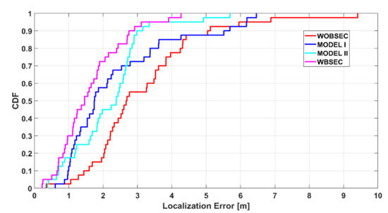 The localisation performance of the proposed system was compared with two other studies that proposed different models for angle estimation and BSE compensation, including the work presented in [17], referred to as MODEL I, and in [20], referred to as MODEL II. To compare the relative accuracy of the proposed system with these studies, we mainly implemented the angle estimation and compensation models as proposed by the researchers, and then applied the fingerprinting localisation method. For example, the use of multiple wearable devices and Semcad simulation parts were omitted for MODEL I, and Kalman filter and path loss model implementation were overlooked for MODEL II. Moreover, identical preprocessing of the raw data was considered, and the same weight calculation method was applied for all the cases with a value of 3 for , both in the K-NN and WK-NN algorithms.