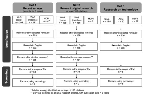 - Set 1. The most recent reviews and surveys on EM that consider/mention technology in their analyses or discussions. The articles in this set will be used to address Q1.