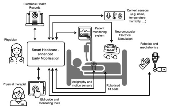 With the smart healthcare paradigm in mind, practitioners and patients could benefit from highly personalised programs, which consider patient physiological parameters as well as the context: the exercises conducted during EM programmes could be objectively monitored with a number of sensors attached to the patient’s body, whose signals (e.g., collected from accelerometers) could verify whether the exercises are performed correctly. Besides, these sensors, data can be used to evaluate the evolution of patients and their adherence to the scheduled programmes, as well as to analyse the outcomes from a global perspective. Robotic-assisted therapy could be used to apply passive mobilisations. Additionally, the use of advanced data analysis techniques, such as artificial intelligence, data mining or process mining, may detect similarities or trends among patients, whose EM programmes could be slightly adjusted with personalised recommendations using the high-level knowledge acquired. The automatic real-time feedback received from sensors data could significantly shorten recovery times and minimise the PICS side-effects.