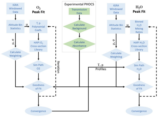 An illustration of the RS and PHOCS data extraction and analysis method. The PHOCS instrument stores raw heterodyne power as well as meta data for a given measurement. From this raw data, a background spectrum is calculated from spectral points removed from absorption features, and an absorption spectrum is generated. Informed by the meta data, IGRA data is collected from nearby stations, sorted into altitude bins, and statistical calculations for that windowed set are calculated. Polynomial fits of temperature and pressure are performed from the mean of each bin. Spectra for the atmospheric column are then simulated by calculating contributions from each 100 m path along this path by calling spectral cross sections from pre-calculated libraries. Weighted residuals between modeled and experimental spectra are calculated and iterated in a Nelder-Mead algorithm until convergence.
