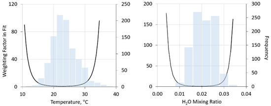 Frequency distribution of lowest altitude (surface to 1 km) temperatures (left) and water mixing ratio (right) in Dulles airport radiosonde launches (grey bars) and the derived “weighting factor” for fitting, as defined in Section 3.1.3 below.