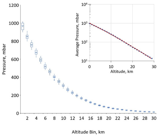 The extracted pressure profiles for the decade-long, 7-day window are sorted into 1 km bins to visualize pressure distributions at different altitudes. Note: the statistical spread for pressure is not discernible in the inset, logarithmic plot.