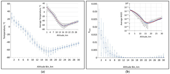 Extracted temperature and water profiles sorted into 1 km bins to visualize distributions at different altitudes. The insets show (a) average temperature and (b) average log10(XH2O) with 1σ deviations shown as vertical bars and 6th order polynomial fits for data over the decade-long, 7-day window.