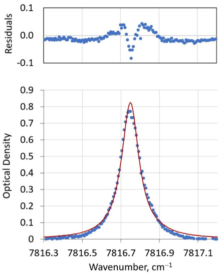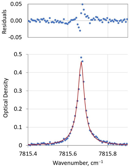 Lower panel: representative fit of PHOCS oxygen line. Experimental data are shown as blue symbols. The red solid curve is the modeled spectrum. The upper panel shows the residuals of the fit. The instrument resolution, 200 MHz or 0.067 cm−1, is the spacing between experimental (blue) points.