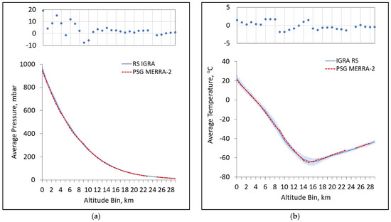 A comparison of the average (a) pressure vertical profile and (b) average temperature vertical profile for our decade-long, 7-day window with standard deviations shown as a blue shaded region and MERRA-2 reanalysis temperature profiles as red dashed lines. Note that MERRA-2 data were only extracted over a decade-long, 1-day window for 29 July 2010–2020. Residuals in the top panels of each figure show the difference between average IGRA values and average MERRA-2 values.