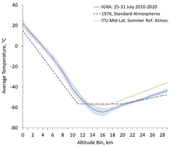 A comparison of the average temperature vertical profile obtained from IGRA for our decade-long, 7-day window with standard deviations shown as a blue shaded region, 1976 U.S. standard atmospheres (black dashed line), and the ITU Radiocommunication Assembly mid-latitude summer reference atmosphere (orange dotted line).