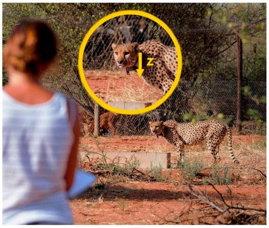 Observer taking notes of a captive cheetah’s behaviour. Captive cheetahs allowed observers to approach to approximately 10–20 m. Collars were set to record acceleration data on the z-axis (yellow arrow in insert), which translates to up-down movements.