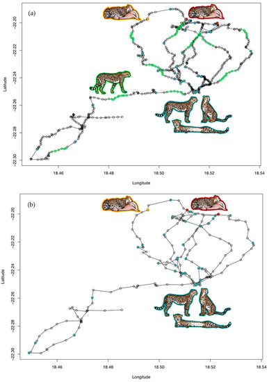 Figure 2 illustrates nine days of GPS coordinates of two males of coalition 2 with GPS intervals of 3 min and 15 min, respectively. Both males revealed almost an identical movement path, and the same feeding and resting clusters were detected in the corresponding ACC data. While two feeding events (marked red in Figure 2) were previously confirmed in the field with prey remains, the third one (marked orange in Figure 2) was not confirmed in the field, but was identified in both males. Walking events were only detected in the male with the 3-min GPS schedule. All walking clusters corresponded with lacking stationarity, i.e., no GPS clusters, indicating that the animal was indeed on the move. The calculation of resting and walking clusters is described in Appendix A Text A2.