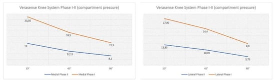 Thirteen patients (61.90%) showed a “balanced” knee without the need for further ligament balancing or additional bone resections at the time of measurement, and eight patients (38.10%) showed an intra-operative “unbalanced” knee and required additional procedures. A total of 13 additional balancing procedures (including soft tissue release and bone resections) were performed appropriately. Mainly, five proximal tibia resections (varus and neutral tibial resection) and two posterior slope tibial recut constituted the additional bone procedures; two collateral ligament (MCL) releases by the pie-crusting method, four sub-periosteal superficial MCL releases were performed to achieve a proper balancing. After balancing procedures were performed wherever required, in all patients (n = 21, 100%), a final compartment pressure difference below 15 lbf was recorded in the entire range of motion (Table 2). Higher absolute pressure values were found in the medial compartment than in the lateral compartment in every degree of ROM examined both in the first measurements (phase I) and after implanting the definitive components (phase II). Moreover, pressure values in both compartments showed a trend to decrease with the increase in flexion degrees. The mean values of both medial and lateral compartment pressures were lower in phase II than in phase I (Figure 7).