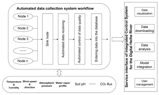 The automated data reception module aims to normalize different data organization modes of observational devices from different sources. Through the programming of the server-side interface of the specific WSN observational device with the software development kit (SDK) [27], the data string transmitted to the server is directly intercepted, and the data are then reorganized as a defined standard data string. The normalized data string simplifies the back-end automated data preprocessing and warehousing procedure.