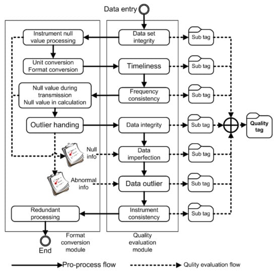 For automated observational data, errors, such as source errors, calibration errors, and transmission errors, occur. Source errors are caused by the observational device itself, calibration errors occur during the calibration and correction of observational data, and transmission errors consist of the operational errors and interference errors incurred during data transmission [28,29,30,31,32]. The data quality control model is deployed in the IODCS to evaluate and control the quality of the observational data using unified standards and a consistent quality control system during the generation, processing, and transmission of data. Moreover, the transformation model deployed in the IODCS describes the conversion type factors during automated data processing, which contributes to the application of a consistent conversion system in the automated process. Additionally, automated observational devices arranged in the field are produced by different manufacturers and use different parameters and data storage formats. Thus, these differences should be converted before data storage to guarantee that the data are stored with unified standards, namely semantics and format. The automated conversion algorithm and the quality evaluation algorithm are sequentially executed in the logical flow of data processing [33]. Figure 3 shows a flow chart of automated data quality control.