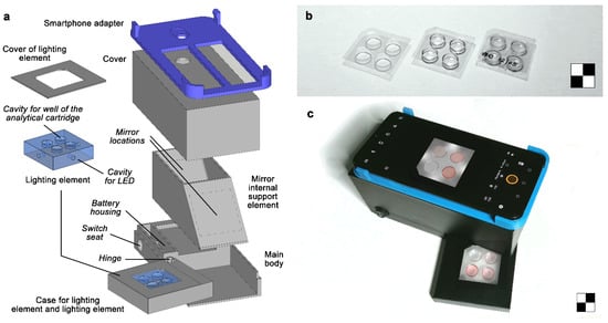 The 3-D-printed components of the assay device (Figure 1a) were designed using the SketchUp Pro 2021 CAD software (Trimble Inc., Sunnyvale, CA, USA). The device has an overall size of 140(W) × 70(H) × 70(D) mm (not including the smartphone adapter, the size of which may vary according to the smartphone model) and was produced by stereolithography (SLA) using a Form 2 3-D stereolitography (SLA) desktop printer (Formlabs Inc., Somerville, MA, USA). The 3-D-printed components were mostly manufactured in black photopolymerizable resin to avoid undesired light reflections and include: (a) a main body, which houses an A27 12V alkaline battery and a switch for powering the LEDs of the lighting element; (b) a case for the lighting element, connected to the central body with a hinge for easy insertion of the analytical cartridge, and a cover to shield the direct light emission of the LEDs; (c) an internal mirror support element with two 40 × 40 mm flat mirrors angled at 45°; (d) a cover to avoid interference from ambient light during the measurement and to support the smartphone adapter; and (e) a smartphone adapter designed for the OnePlus 6 smartphone (OnePlus, Shenzen, China). The lighting element is manufactured in clear photopolymerizable resin and sanded to improve the light scattering capacity. It has four upper cavities to accommodate the wells of the analytical cartridge. Four further small cavities in the lateral faces of the lighting element house the cool white LEDs (color temperature 4000–4500K) that provide illumination of the cartridge. Figure 1c shows the analytical device connected to the OnePlus 6 smartphone in use.