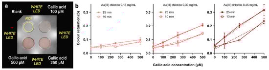 The calibration curves (Figure 2b) indicate that the color intensity, thus the slope of the calibration curve, increases with time. The production of AuNPs is faster for high gallic acid concentrations, so that at short times (i.e., at 10 min of incubation), the calibration curves are quite far from linearity. However, for longer incubation times, as the color saturation increased, the linearity of the calibration curves also improved. After 25 min of incubation, there is a good linear correlation between the color saturation and amount of gallic acid.