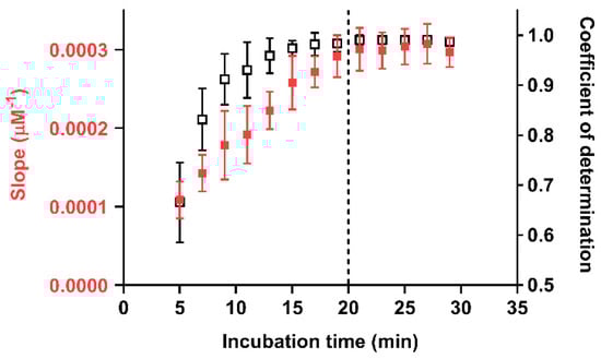 Slope (red) and linear regression coefficient of determination (black) values for calibration curves obtained at different incubation times in analytical cartridges prepared with 0.30 mg/mL of Au(III) chloride. The dashed line indicates the incubation time (20 min) selected for the assay. Each point is the mean ± SD of three experiments.