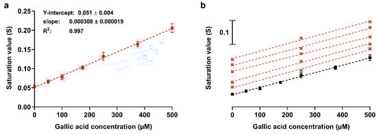 To evaluate the assay performance, a reference calibration curve was generated by analyzing gallic acid standard solutions (since each cartridge allows measurement of four samples, the calibration curve was obtained using several cartridges). The calibration curve (Figure 4a) confirmed the good linear correlation between the color saturation and concentration of gallic acid in the investigated range (up to 500 µM). It also allowed estimation of the limit of detection (LOD) of the assay for TAC expressed as gallic acid equivalents, which is defined as the gallic acid concentration giving a color saturation corresponding to that of the blank plus three times its standard deviation. The LOD value (30 µM) was in the same order of magnitude of that obtained for other paper-based assays [37] and similar to that calculated from our gallic acid calibration curves for ORAC (5 µM) and ECL (30 µM). This proved that the assay is suitable to measure the TAC of teas, herbal infusions, beverages, and food extracts. As concerns sample dilution, dilution factors ranging from 1:100 to 1:1000 (v/v) depending on the TAC value proved adequate for our samples.