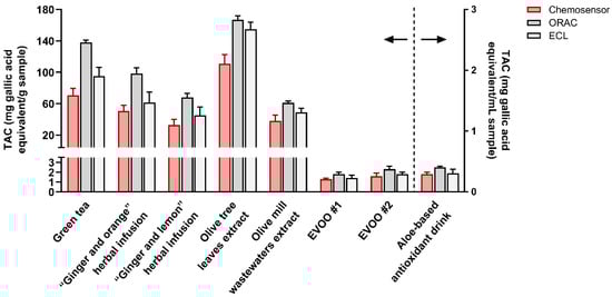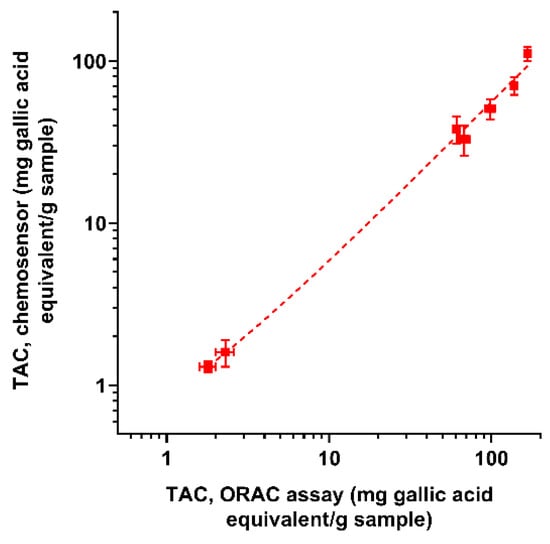 To assess the assay accuracy, the TAC values measured by the smartphone-based AuNPs chemosensor were compared with those obtained using the ORAC and ECL reference TAC assays (results also shown in Figure 5, while Figure 6 shows the correlation between the chemosensor and ORAC TAC results). In general, different TAC values were obtained for each sample with the three methods. This is expected, as methods are based on different reaction mechanisms [17]. In particular, while ORAC and ECL assays rely on the radical scavenging activity of antioxidant compounds in the sample, the developed sensor relies on the reducing ability of antioxidants to Au(III). The TAC values obtained with the chemosensor were appreciably lower than those of the ORAC assay but closer to those of the ECL assay. Nevertheless, for all the assays, the TAC values of the different samples showed similar trends (Figure 6), indicating that the chemosensor could reliably discriminate between samples with different antioxidant contents as well as reveal changes in TAC due to food processing or storage.