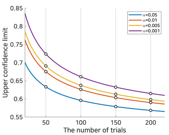 where represents the expected chance level and z1−α/2 represents the 1 − α/2 quantile of the standard normal distribution N(0,1). Applying this to left/right hand motor imagery BCI consisting of 100 test trials (50 per class), where the expected chance level, , would be 0.5 and the theoretical lower and upper 0.95 (1 − 0.05) confidence limits would be 0.4039 and 0.5961, respectively. The upper limits of the theoretical random probability over various trials and several confidence levels are computed and illustrated in Figure 2.