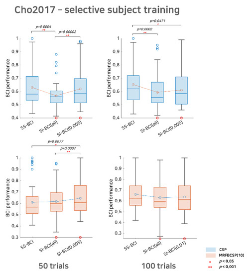For Cho2017 dataset, as shown in Figure 3, with the CSP method, SI BCI-All yielded a performance distribution that differed significantly from that of SS BCI for both the 50 sub-trials and 100 trials settings (p = 0.0004 and p = 0.0002, respectively). On the other hand, the result for SI BCI-.005 for 50 trials was comparable to SS BCI but differed significantly (p = 0.00002) from SI BCI-All. This indicates that SI BCI- is applicable without the calibration phase and may achieve better performance than SI BCI-All (without selection) and comparable performance to SS BCI that requires the calibration phase, and thus, is promising. For 100 trials, we found that SI BCI-α = 0.005 demonstrated improved performance (from 0.5936 to 0.6102) compared to SI BCI-All, while the difference in the performance distributions between SI BCI-α = 0.005 and SS BCI was slightly significant (p = 0.0471). Looking at the difference in the performance distributions, SI BCI-All yielded 33 bad performers in BCI classification (lower than 0.6) and 9 good performers (higher than 0.7); however, SI BCI-α = 0.005 yielded 27 bad performers and 14 good performers. This observation implies that this selective subject pooling strategy may help improve SI BCI performance, and, in some cases, performance may be comparable to that in SS BCI.
