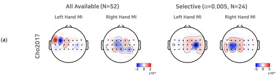To investigate the effect of a selective subject pooling strategy at the feature level, we compared the CSP filters calculated from all subjects and subjects from the selective subject pools for each dataset. For simplicity, we present the first and last CSP filters only (Figure 5). As we selected electrode channels (21 or 20) around the motor cortex (see Section 2.1 to train the CSP, for illustration purposes, we note that the scalp topographic CSP filters were zero-padded for channels other than the channels selected (selected channels are presented as dots in the scalp topography). For Cho2017, when all subjects available were used to train the CSPs, we observed that the first (left hand MI) and the last CSP (right hand MI) did not show the contralateral activation pattern clearly, and thus the corresponding SI BCI-All yielded a performance that was quite inferior to SS BCI. On the other hand, the first and last CSPs for the selective subject pools created at α = 0.005 showed clear contralateral activations around electrodes on the left motor cortex (C3) and right motor cortex (C4), which are consistent with the neurophysiological findings [31,32]. In the case of Lee2019, we observed contralateral activations from the first CSP filters calculated from all subjects available. The CSP filters calculated from selective subjects at α = 0.001 showed more focal and contralateral activation around electrodes on the left motor cortex (C3) and right motor cortex (C4), but the difference was not as great as that observed with Cho2017.