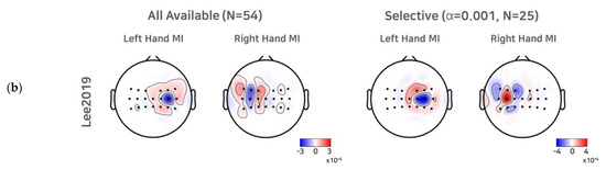 These results may be inferred from the CSP filters shown in Figure 5. In the Cho2017 dataset, the CSP filters calculated from all subjects available showed no clear patterns, but the filters calculated from the selective subjects showed clear contralateral activation patterns. Hence, training all subjects available and only selective subjects may be quite different. On the other hand, in the Lee 2019 dataset, the CSP filters did not change as dramatically as in the Cho2017 dataset, and thus, training all subjects available and only selective subjects may be quite similar.
