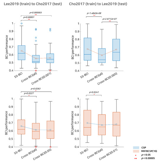 In addition to SI BCI performance, we investigated the selective subject pooling strategy’s feasibility to evaluate cross-dataset BCI. The cross-dataset BCI performance, including Cho2107 (train) to Lee2019 (test), and Lee2019 (train) to Cho2017 (test), is listed in Table 3 and illustrated in Figure 6. In terms of the Cho2017 cross-dataset BCI performance, training with Lee2019 did not benefit from the selective subject pooling strategy, as BCI performance with all subjects available in the Lee2019 dataset was 0.5545 and performance with selective subjects at α = 0.001 was 0.5623 for the CSP; however, for the MRFBCSP, the selective subject pooling strategy decreased the cross-dataset BCI performance slightly. Figure 6 shows that cross-dataset BCI performance in Cho2017 when CSP is trained with subjects from the Lee2019 dataset decreased BCI performance dramatically compared to SS BCI performance, and selective subject pooling did not improve performance. The MRFBCSP method showed similar results, although their BCI performance was better than that of those with the CSP method. On the other hand, for cross-dataset BCI performance of Lee2019, training with Cho2017 benefited highly from the selective subject pooling strategy. SI BCI performance using all subjects available in Cho2017 was 0.5988 and it increased to 0.6723 with selective subject training at α = 0.005. With respect to the MRFBCSP, it showed better ability to be generalized across datasets and better cross-dataset BCI performance compared to the CSP. The selective subject pooling strategy increased cross-dataset BCI performance from 0.6742 (all subjects available in Cho2017) to 0.6844 (α = 0.01), but the improvement of the MRFBCSP was not as great as with the CSP method (Figure 6).