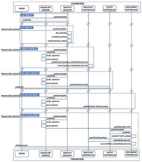 To enable these conditions, a proxy structure has been designed that basically verifies both identity and signature, and then deserializes the payload in order to obtain the service to be executed. For this purpose, the proxy relies on other structures, such as the signature verifier and the identity registry, which are involved in the other functionalities except for the Set Identity where the payload of expression (3) only contains the public key of the entity. In this regard, the Get Identity functionality is only executed within the chaincode and is called several times in all functionalities, in order to retrieve the public key for an entity with a registered identity. In addition, the Update Whitelist functionality stores the set of relations of the public key with the Modbus service index in the DID Document. On the other hand, the Get Entity’s Identity functionality returns to off-chain side the public key associated to an identity. Additionally, the Set DID Document functionality allows to create and later update the DID Document. Finally, the Get DID Document functionality allows to retrieve the DID document, for which, a JSON Web Token (JWT) must be included to prove not only the identity of the client, but also the validity of the authorization given to use the service defined in the whitelist. Thus, the public key associated to the CH identity is used to retrieve the Modbus service(s) index(es) from the whitelist, returning to off-chain side, the DID Document associated to the CH-related services in provisioning phase.