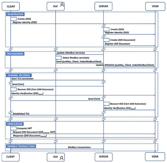 In order to integrate the concepts defined in the Section 4.1, as well as to provide an overview of mbapSSI, Table 1 relates the parts that compose an SSI system with the mbapSSI system phases. In this regard, the registration phase provides the Modbus device (holder) with a decentralized identity, ensuring that this identity is registered in the VDSR. In this phase, the DID has been integrated into the X509 certificate. In the provisioning phase, the Modbus server’s owner (user) matches the Modbus clients with the Modbus services to be used, so that the authorization whitelist is updated. It should be noted that the provisioning phase is unrelated to the others, so it can be repeated at any time. The channel securing phase provides the Modbus devices (both being holders and verifiers as it will be clarified later on), with on-chain authentication, as well as the establishment of a secure TLS channel []. The verification phase authorizes the Modbus client (holder) to use a resource, i.e., a Modbus service, through a proof of identity provided by the on-chain query of the authorization whitelist, where the Modbus server (verifier) is involved. Finally, Modbus transactions phase enables the exchange of Modbus frames through a secure channel between Modbus client and server (both holders). The VDSR is involved in all phases of mbapSSI except when Modbus devices transact with each other to ensure both low levels of latency and high throughput.