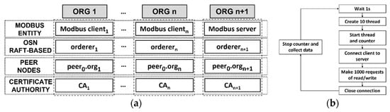 Three performance metrics (processing time, latency, and throughput) are used for the performance evaluation. Processing time represents the time required for a process (e.g., a piece of code) to handle a given request. Latency is a measure of round-trip delay. Throughput constitutes the ratio of the total transactions committed into the ledger in 1 s (not all the sent transactions are always committed in the same second and are pooled in the ordering node). The three metrics are evaluated in different ways, so processing time is used to measure the performance of the mbapSSI phases: registration, channel securing and verification (hereinafter referred to as “three-phases”); latency is used to measure the performance of Modbus transactions; throughput is used to measure the performance of mbapSSI interactions with HFB. Similarly, scalability is another important point in the evaluation of mbapSSI performance, to determine the behavior of mbapSSI due to the increase of organizations and therefore of requests, an n:1 connection pattern is followed, i.e., “n” clients to “1” server. The provisioning phase is not measured since it constitutes an OOB mechanism isolated from the other phases. The remainder of this section examines the testbed used and the experiments conducted to demonstrate the feasibility of mbapSSI.