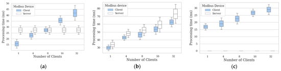 This experiment aims to measure the behavior of the processing time of the three-phases of mbapSSI under the stimulus of scaling the number of Modbus clients connected simultaneously in ratios of 4:1, 8:1, 16:1 and 32:1, following the architecture of Figure 4a. The maximum number of clients is 32, since this is the number commonly supported by real devices such as the MGate MB3170/3270 as shown in its technical documentation []. Unlike the previous section, this experiment focuses on analyzing only the behavior of processing time for three-phases of mbapSSI, using the same tools as in the first experiment, i.e., expressions (4) and (5). For this purpose, 10 processing time measurements are collected for each of the three-phases.