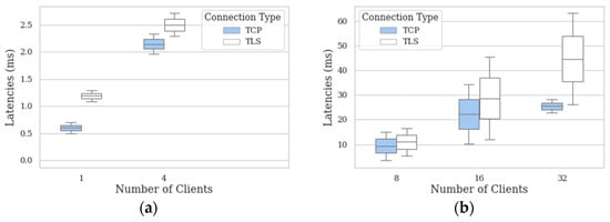 The isolation of the fourth phase of mbapSSI aims to ensure that once the first three phases of mbapSSI have been successfully completed, the Modbus transactions maintain the requirements of simplicity, compatibility, and interoperability. For this purpose, using as a reference the latency achieved by applying the performance test in Figure 4b over Modbus TCP, the same experience is compared over Modbus TLS. Figure 6 includes the repetition for the experiment (latencies’ measurements for Modbus transactions) for the next client–server architectures: 4:1, 8:1, 16:1 and 32:1.
