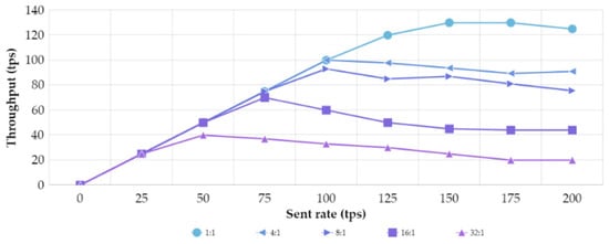 As mentioned in Section 5.2.4, 1000 transactions are sent at variable rate for each of the five possible network scenarios to determine the performance of these transactions. Based on the chaincode design of Figure 2, the setIdentity method was selected as the test method because it is performed by the participant entities at boot time. Considering that the block size is fixed at 100 transactions per block or 2 MB [] and that the validation policy forces all organizations to validate transactions, i.e., all organizations have the same weight in the consensus, Figure 7 shows the throughput behavior for each of the defined architectures.