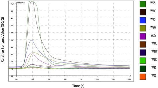 Typical output of the PEN3 to a late CRC urine samples, where each curve representing output from a different sensor.