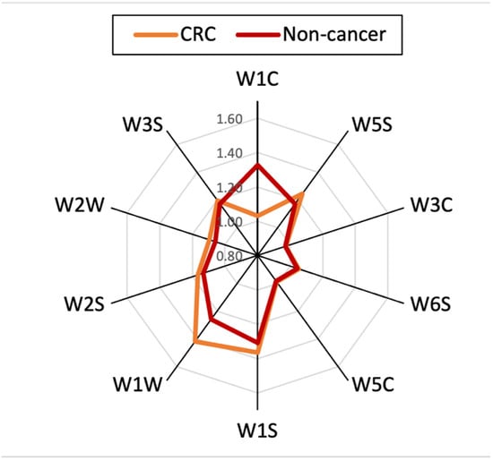 Radar plot in Figure 4 shows the average response of the sensors corresponding to the early-stage CRC (green line), late-stage CRC (orange line), and non-cancer group (red line).