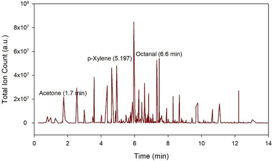 Figure 6 provides an example output from the GC-TOF-MS. Here, the x-axis refers to the retention time, and the y-axis, the total ion count.