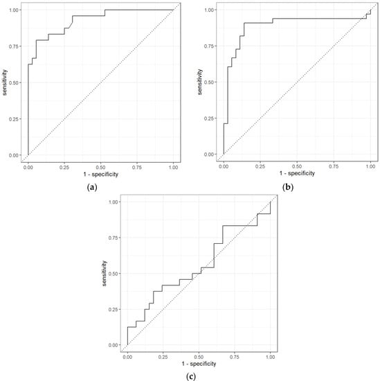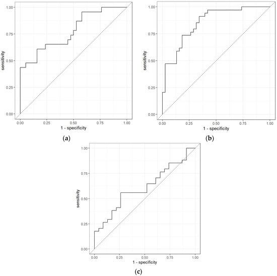 For the early-stage CRC vs. non-cancer comparison using GC-TOF-MS, results show that out of 24 early-stage CRC samples, 16 were correctly diagnosed as CRC samples giving sensitivity of 0.67 and out of 38 non-cancer samples, 34 samples were correctly recognized as non-cancer samples giving specificity of 0.94. As for late-stage CRC vs. non-cancer samples, 26 samples out of 34 were correctly diagnosed as CRC samples giving 0.79 sensitivity and 32 samples were correctly recognized as non-caner samples out of 38 giving specificity of 0.89. However, the results obtained for the comparison between early-stage vs. late-stage were moderate. The sensitivity obtained was 0.46 signifying that 11 early-stage samples were correctly diagnosed, and specificity obtained was 0.61 indicating that 20 late-stage CRC samples were correctly diagnosed. Figure 9 shows the ROC curves for these comparisons.