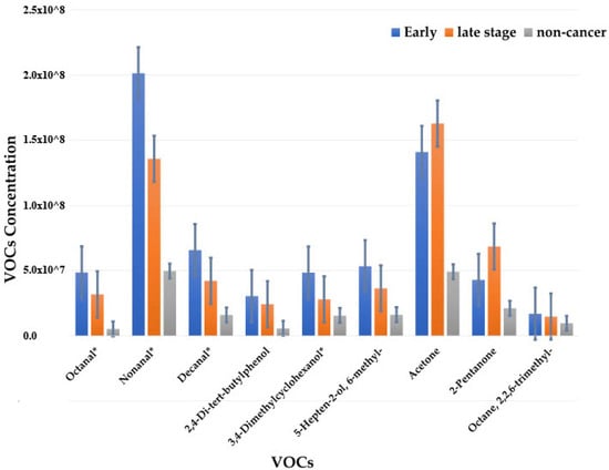Bar graph for the VOCs present in the study with their respective average concentration among early-stage CRC, late-stage CRC, and non-cancer samples. The * mark represents statistically significant VOCs.