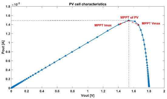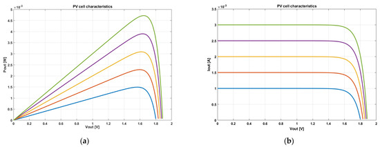 After simulation of the system-level mathematical model, the output characteristics of photovoltaic cells under different illumination are shown in Figure 2. When the load current is large, and the voltage is small, a PV cell can be equivalent to a current source at this time. On the contrary, while the load impedance is large and the output voltage tends to be large and unchanged, it can be equivalent to a voltage source [18,19].