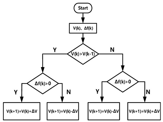 In Figure 4, V(k) represents the system output voltage, ∆f(k) represents the adjusted clock frequency, and its essence is the same as ∆V(k). When the frequency change increases the system output voltage, MPPT will Keep this change. On the contrary, it will make this change in the opposite direction. In summary, MPPT has a more macro definition. Once the MPPT controller is put into the power management system for analysis, it can track the maximum power point, maximum voltage point, or maximum current point [20,21].