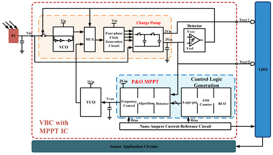 As a result, the design uses a charge pump as the main body of the boost converter. Figure 5 shows the overall boost converter logic diagram we proposed. The IC system we design includes a high PCE four-phase boost charge pump, a P&O MPPT control module, a nano-ampere current reference, a high-precision comparator, a four-phase clock generation circuit, and a current-starved VCO, etc. The whole IC is a closed-loop system, which can track maximum PowerPoint by self-detection. The Vout of VBC will be given to LDO, and then the regulated voltage can be used in sensor application circuits. This power system management can apply in small WSNs powered by PV cells.