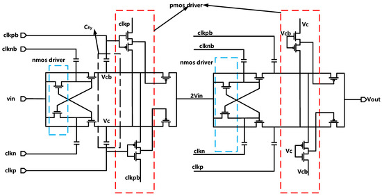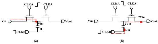 Figure 6a,b illustrate the charging and discharging process of a simple charge pump. A pair of CMOS structures is used as a switch, which is controlled and driven by timing. CLKA and CLKB are two-phase non-overlapping clocks; the amplitude is VDD. In a single period, the capacitance is charged twice, and the upper plate is 2 Vin. We can derive that CP has doubled the voltage. Besides, the charge pump is cascaded into a multi-stage charge pump to obtain a high voltage boost multiple. However, it will result in a significant reduction in conversion efficiency. Since the cascade structure only makes the last stage output impedance in effect, and the output impedance is limited. Thus, we hope to increase the output impedance as much as possible.