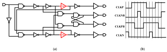 (a) Four-phase clock generation circuit; (b) Four-phase clock logic diagram.