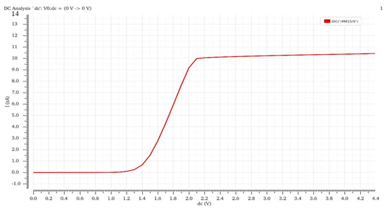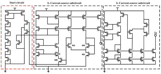The power management system (PMS) usually needs a current reference to provide a stable and independent power supply current [27,28]. Since the current drive capability of solar photovoltaic cells is very limited, the power loss of the internal module must be ultra-low. The nano-ampere current reference circuit proposed can solve the problem [29,30,31]. According to the contrary temperature characteristic of electrons and holes, the reference current has a weak temperature sensitivity. After the output voltage is established, the nano-ampere current reference circuit provides current to other modules. Besides, a relatively stable voltage can be provided by the reference circuit. The detector module gets the information of switching modes by comparing Vref and the control voltage of VCO.
