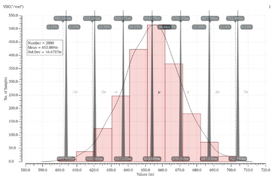 Distribution of output reference voltage with Monte Carlo simulations of 2000 runs.