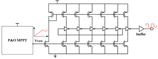 Figure 9 also shows the MPPT control clock generation module. The module provides the signal that needs to control the clock for the MPPT module. The initial clock of this design is generated by the ring oscillator (RCO), and the clock generates five kinds of control clocks through the operation of the four-bit counter (consists of DFF) and the logic control module. The current of the ring oscillator is provided by a nano-amp current reference circuit, the period of the clock signal generated by the oscillator is 5 μs, and the period of the output control signal is 80 μs.
