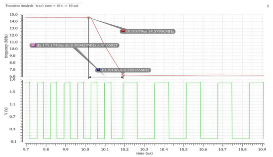 As Figure 14 plotted, a current-hungry VCO this paper proposed has a quick frequency response. When the control voltage is reduced from 450 mV to 400 mV, the frequency changes from 14.5 MHz to 6.22 MHz.